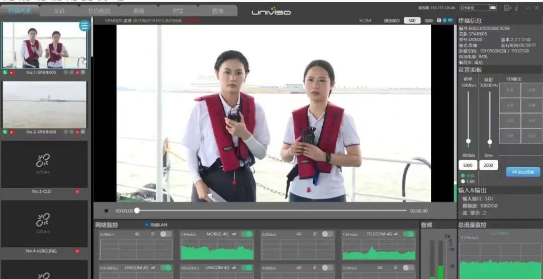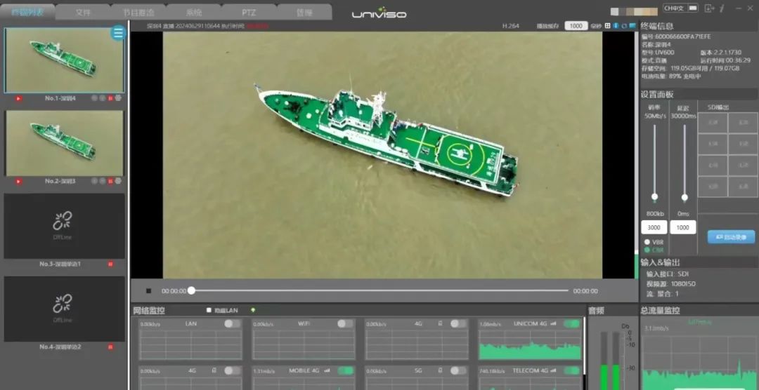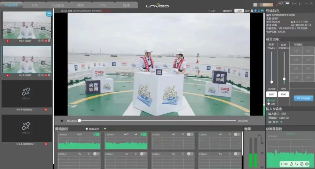 依托于壹唯视自研的弱网聚合智能i-MUX传输算法,本次直播很好地解决了人多聚集时信号基站拥塞、海上5G信号覆盖弱等问题,成功地将环境海中呈现大桥最好视角的船上画面、采访连线画面、卫星拍摄画面、穿越深中通道的汽车视角画面等海陆空多维度多机位画面回传,保证了弱网环境下的画面流畅度和直播安全性。