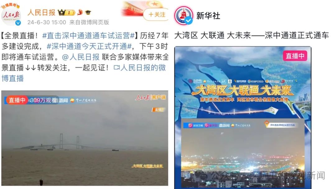 6月29日上午10时,由深圳广电集团发起,联合中山广播电视台和香港、澳门等大湾区各城市多家媒体开展的“大湾区 大联通 大未来!——深中通道正式通车 湾区城市联合全媒体大直播”正式上线开播,超100家中央媒体、大湾区城市媒体、主流新媒体平台和账号同步直播,全网直播实时播放量超4000万。